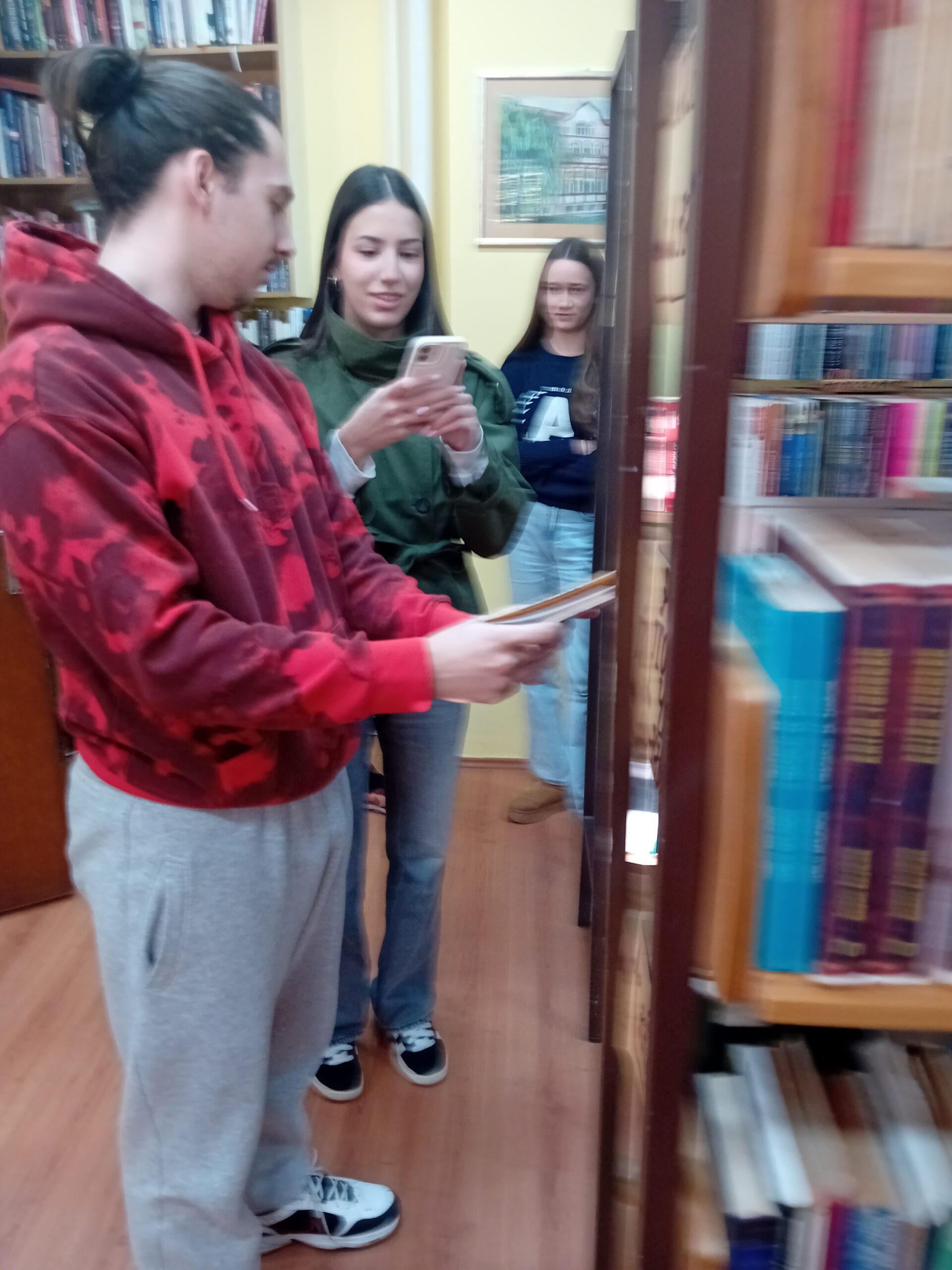 Поводом Националног дана књиге и акције „Читајмо гласно“, ученици гимназије „20. октобар“ су заједно са професотицом Зораном Миладиновић посетили Народну библиотеку „Вељко Петровић“ и одељење за одрасле кориснике. Ученици су обишли наше одељење и упознали се са фондом који се налази на полицама, прелистали књиге које су им биле интересантне, а затим су читали одломке из лектира за трећу и четврту годину на српском, руском и немачком језику. Том приликом су прочитани одломци забележени камером од чега је направљен кратак филм.