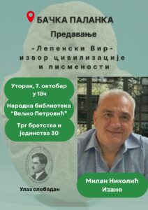 У  Народној библиотеци „Вељко Петровић“, у уторак,  7. октобра Милан Николић Изано одржао је занимљиво предавање на тему -„Лепенски вир-извор цивилизације и писмености“. Током предавања Изано је говорио о енергетским линијама, о претходним знањима који сежу од лепенског вира до данас, те  илустративно уз помоћ слајдова представио нова сазнања до којих је дошао.